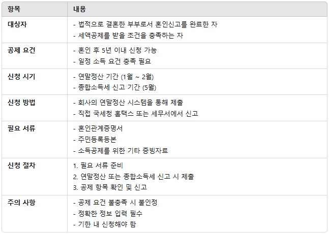 - 필요 서류: 혼인신고증명서, 소득공제 관련 서류 등을 준비해야 합니다.