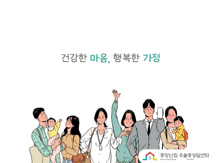 중앙난임 우울증상담센터는 난임과 관련된 심리적 문제를 전문적으로 다루는 기관입니다. 이 센터는 가족의 행복과 건강한 마음을 위해 다양한 프로그램과 상담 서비스를 제공합니다. 센터의 로고는 가족과 지원을 상징하는 디자인으로, "건강한 마음, 행복한 가정"이라는 슬로건을 내세우고 있습니다.