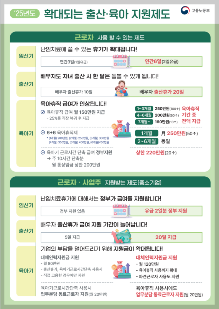 육아휴직 중 대체인력에 대한 지원금도 신설됩니다. 이는 육아휴직을 사용하는 부모님이 직장에서 부담을 줄일 수 있도록 돕는 제도입니다.